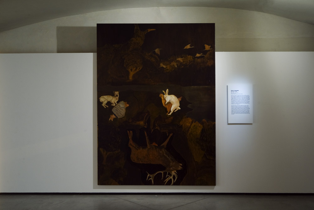 | The canvas shows a surreal scene charged with mystery: normal animals are portrayed in unusual attitudes and poses in a dark landscape. The meaning of this scene is not immediately clear and it is open to the different interpretations that each spectator can provide. This, because the Black Brain project is rooted in the impossibility of defining a single unambiguous meaning for anything. Even the work of art's physical status is the object of a process that causes it to change in time rather than to have a stable connotation. The picture undergoes structural changes which alter its aspect in the various exhibition centres that host it thanks to changes in its frame. Paolo Chiasera tackles a traditional genre like painting by questioning the value in merely depicting reality, underscoring instead its nature as the translation of obscure and evocative form and content into a new vocabulary. |