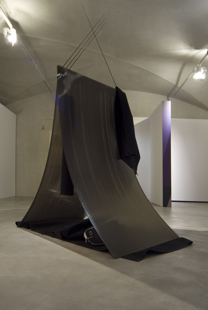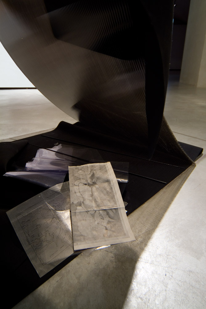 Christian Frosi's installation comprises two large black panels leaning on one another in a precarious state of balance. At the base of this structure, images of the sky at different times of day, cloud formations and views of the Australian outback seen from above are set alongside one another, offering different yet overlapping viewpoints from the ground and from the sky, as in bird flight. In pitting the plastic presence of sculptural elements against the weightlessness of images, Frosi focuses on the complex relationship between man and nature, vacillating between scientific assessment and poetic abstraction. The artist himself says: